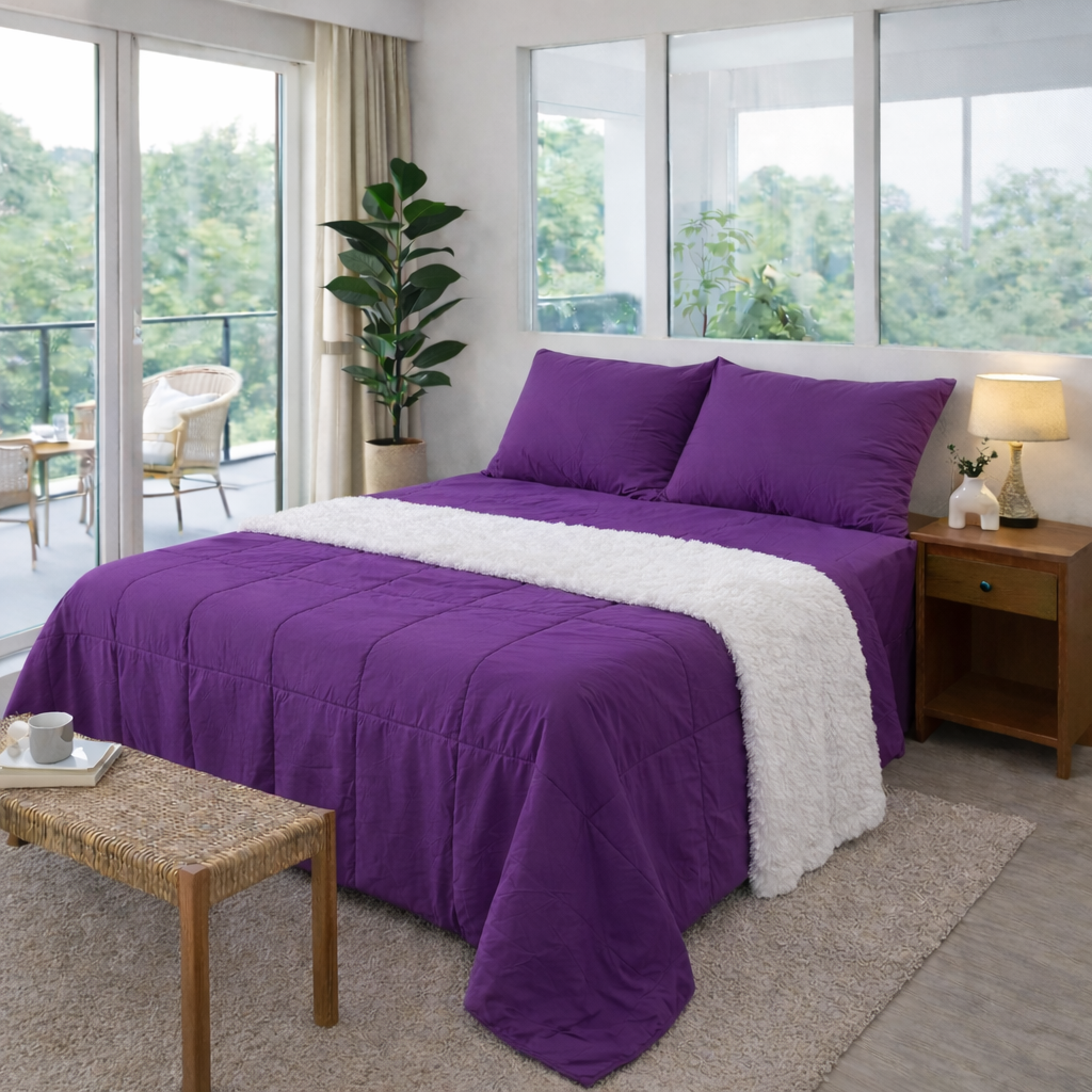 INCLUYE: 1 edredón (1 cara tela bramante y la otra piel de carnero premiun) y 2 fundas de almohadas.
