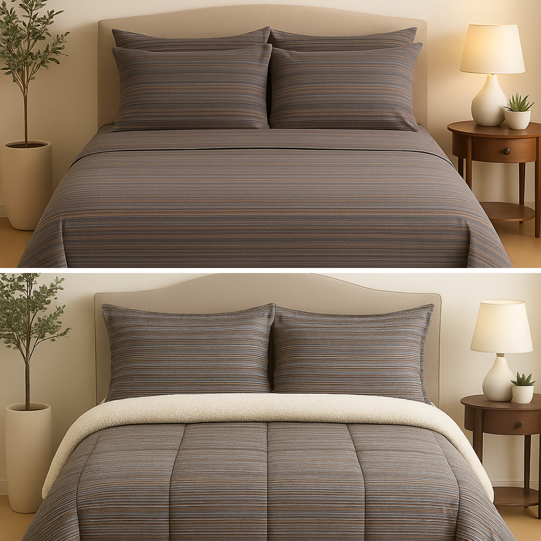 INCLUYE : Juego de sabanas y Cobertor (1 cara tela bramante y la otra piel de carnero premiun) (7 piezas: sabana liga, sabana plana, edredón y 4 fundas de almohadas).