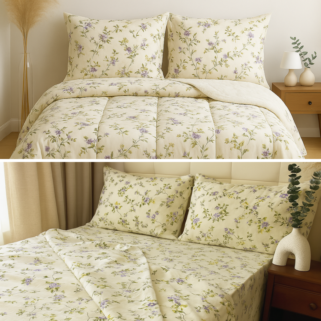 INCLUYE : Juego de sabanas y Cobertor (1 cara tela bramante y la otra piel de carnero premiun) (7 piezas: sabana liga, sabana plana, edredón y 4 fundas de almohadas).