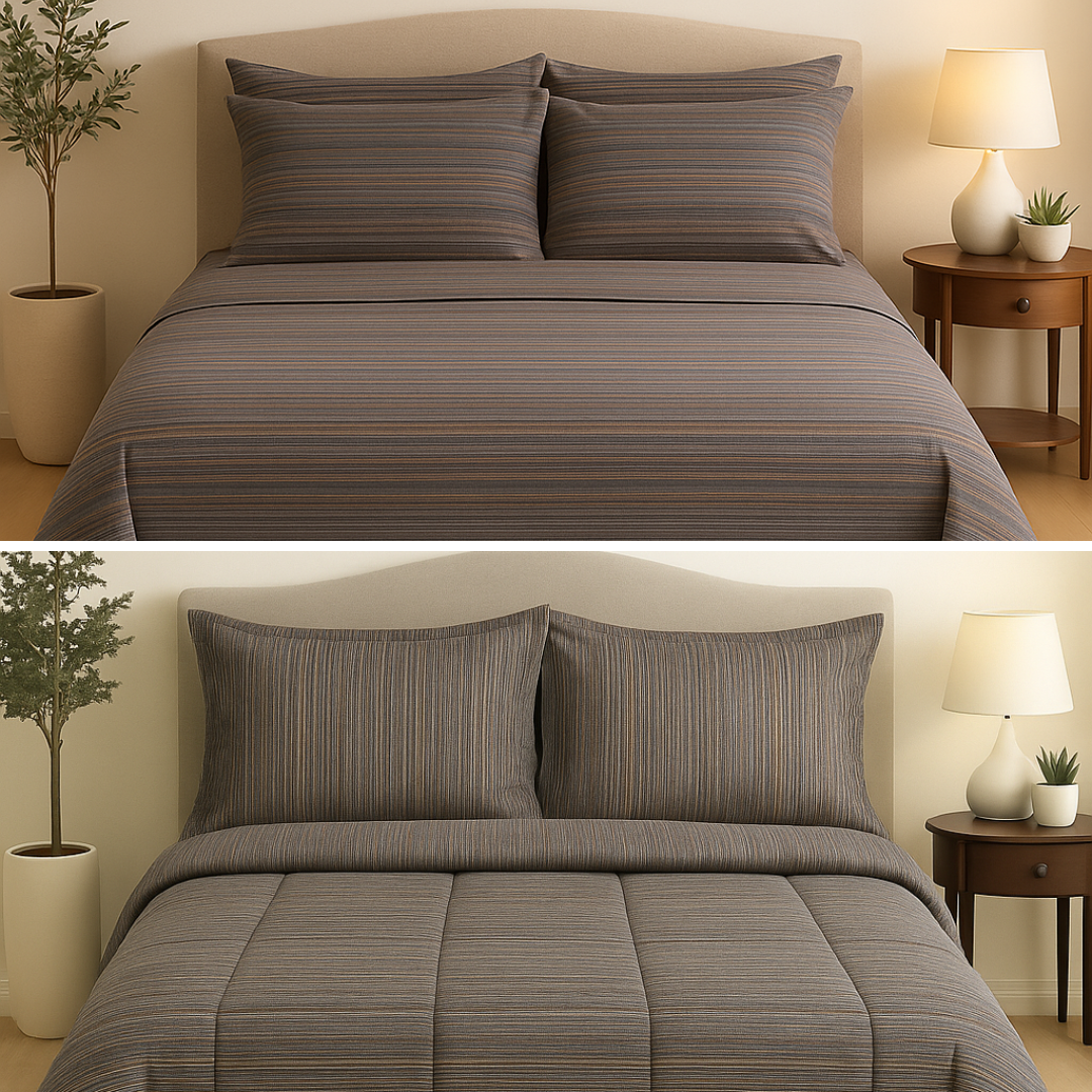 INCLUYE: Juego de sabanas y cobertor doble cara (7 piezas: sabana liga, sabana plana, edredón y 4 fundas de almohadas.