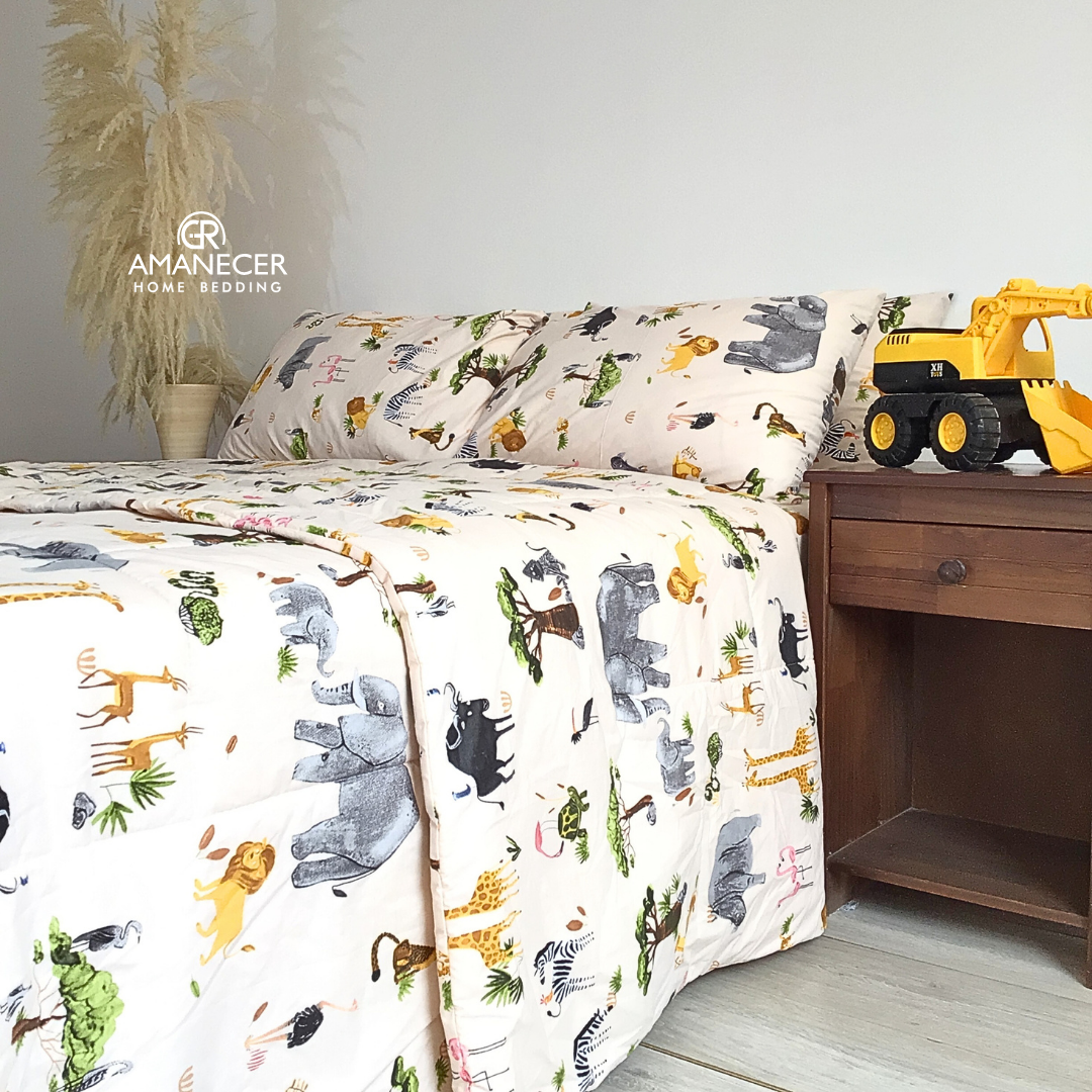 INCLUYE: Juego de sabanas y cobertor doble cara (7 piezas: sabana liga, sabana plana, edredón y 4 fundas de almohadas.